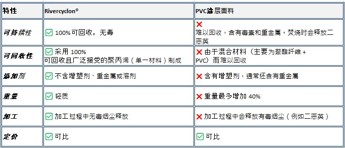 上表说明了 Rivercyclon® 在可持续性、耐用性、毒性、重量和价格方面如何优于 PVC 涂层织物,使其成为注重环保和质量的应用的更佳选择。
