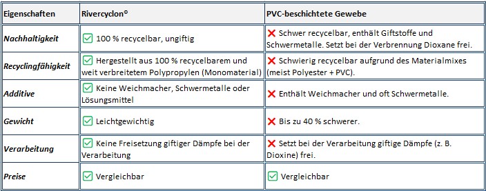 Die obige Tabelle veranschaulicht, wie Rivercyclon® PVC-beschichtete Gewebe in Bezug auf Nachhaltigkeit, Haltbarkeit, Toxizität, Gewicht und Preis übertrifft und somit eine überlegene Wahl für umweltbewusste und qualitätsorientierte Anwendungen darstellt.