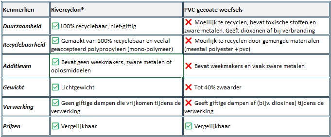 De bovenstaande tabel laat zien hoe Rivercyclon® beter presteert dan met PVC gecoate stoffen op het gebied van duurzaamheid, slijtvastheid, toxiciteit, gewicht en prijs, waardoor het een superieure keuze is voor milieubewuste en kwaliteitsgerichte toepassingen.